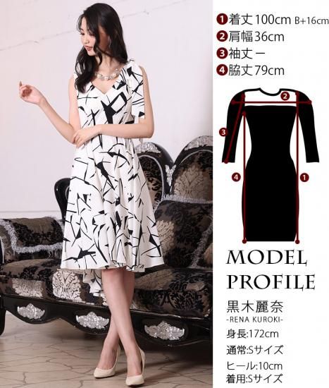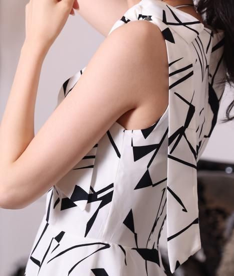 セール|韓国製 | rinfarre | ホワイト×ブラック 肩リボン ノースリーブ Vネック アシメントリー Aライン フレア ミディアムドレス