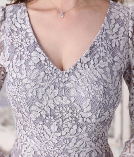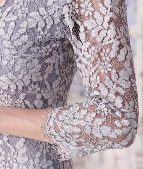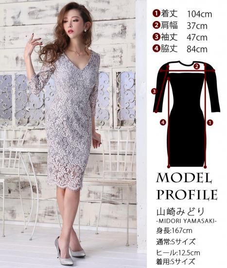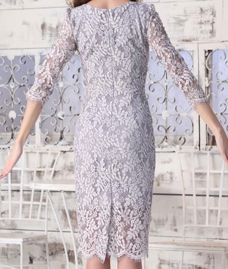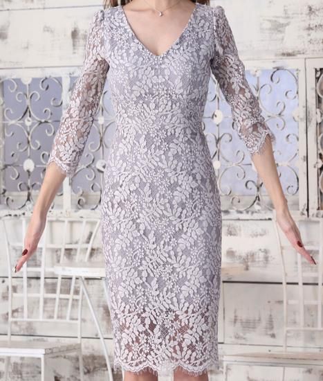 韓国製 | rinfarre | グレー 総レース エレガント 七分袖 Vネック タイト ミディアムドレス ワンピース my