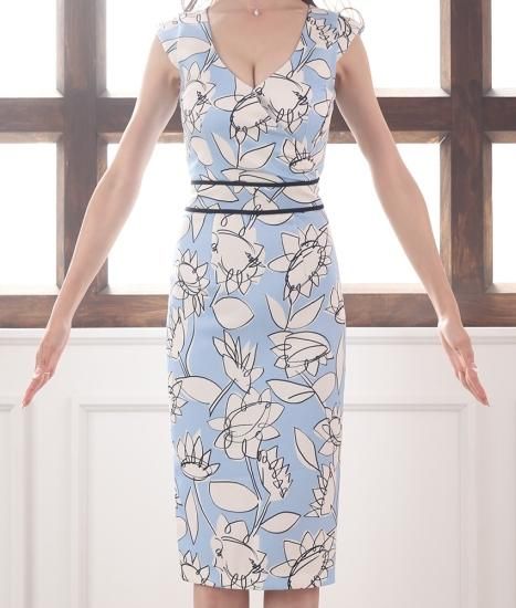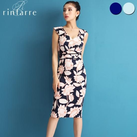セール | 韓国製 | rinfarre | 花柄 ハイウエスト フレンチスリーブ ハートカット ノースリーブ タイト ミディアムドレス ワンピース mylu