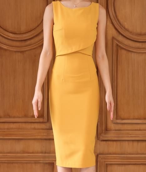 韓国製 | rinfarre | シンプル 無地 ボートネック フロントクロス ノースリーブ タイト ミディアムドレス ワンピース