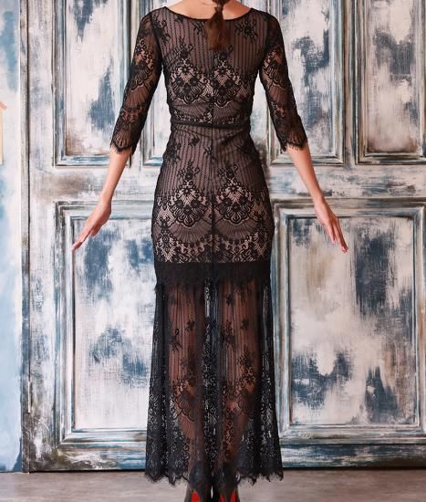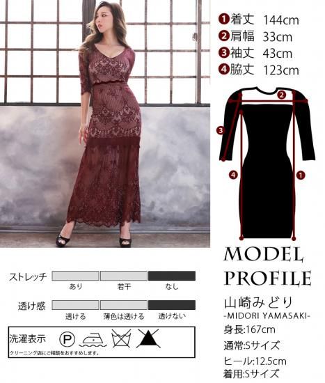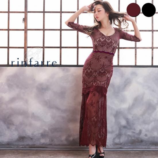 韓国製 | rinfarre | ウエストライン 総レース 裾シースルー ストレッチ マーメイド 七分袖 ロングドレス mywn