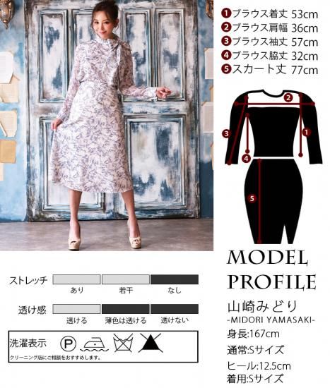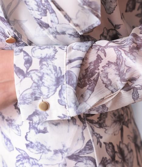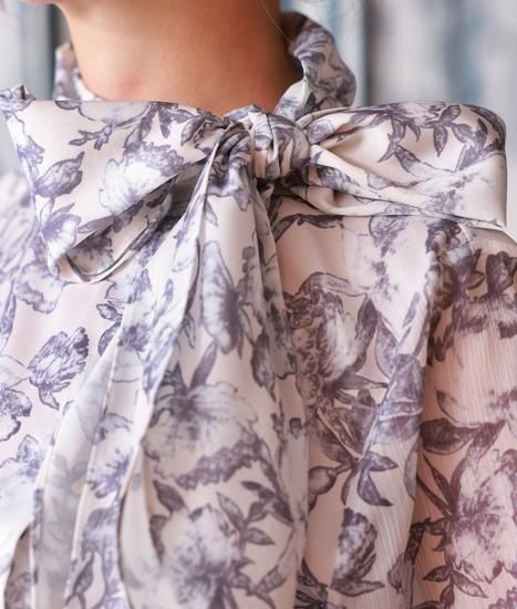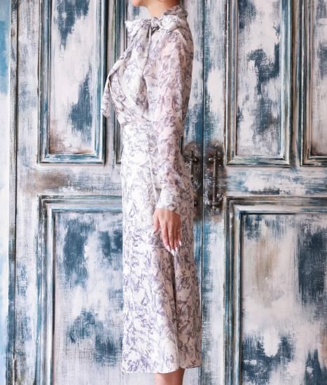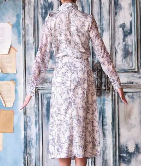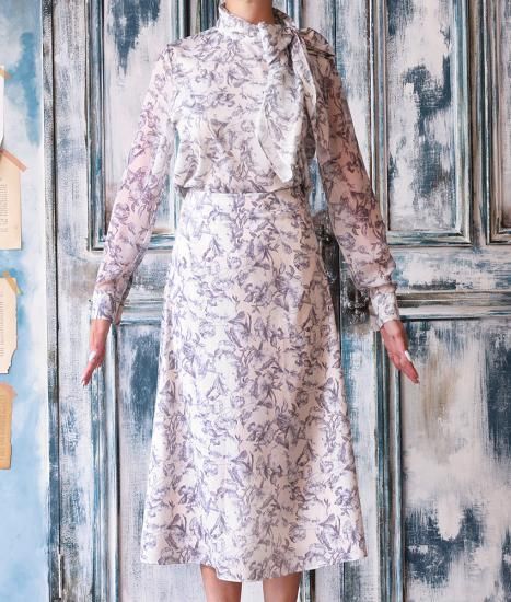 セール|韓国製 | rinfarre | ライトグレー ぼかし花柄 プリント リボンタイ 長袖ブラウス フレア ミディアムスカート セットアップ ツーピース my