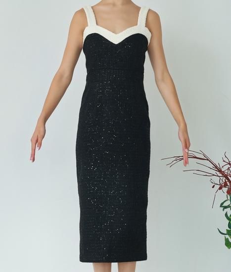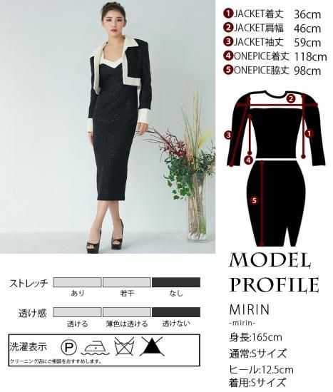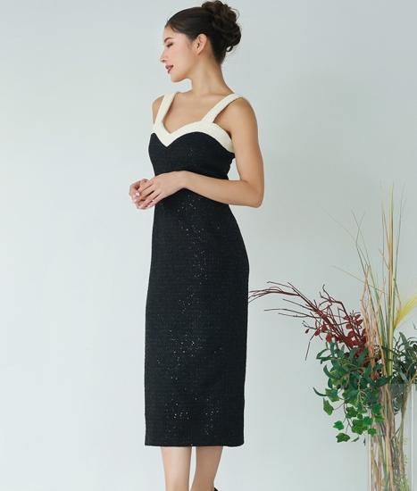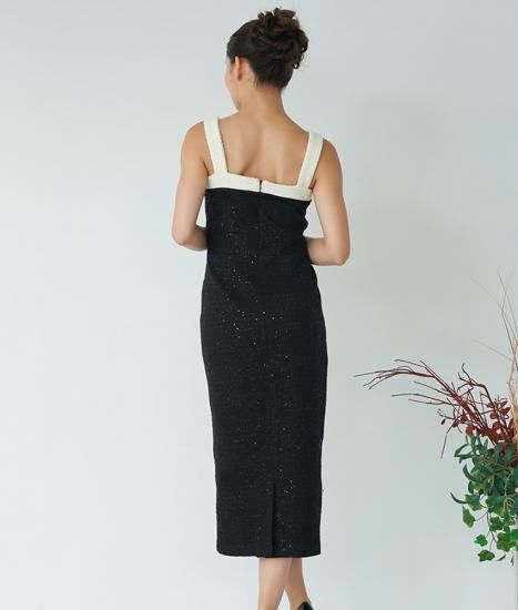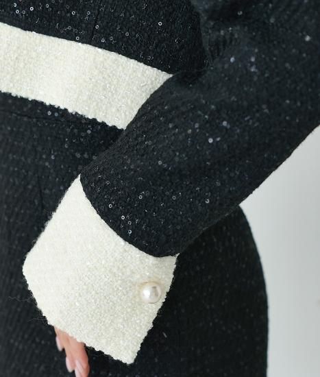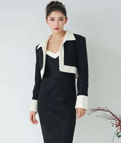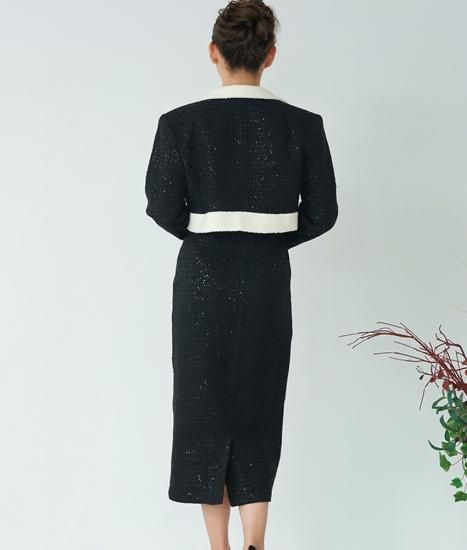 韓国製 | rinfarre | ジャケット セットアップ ブラック ライン入り ツイード 長袖 ノースリーブ ミディアムドレス ワンピース