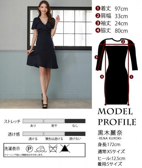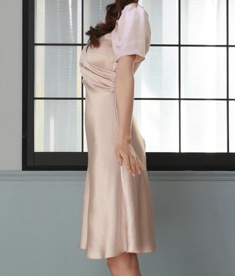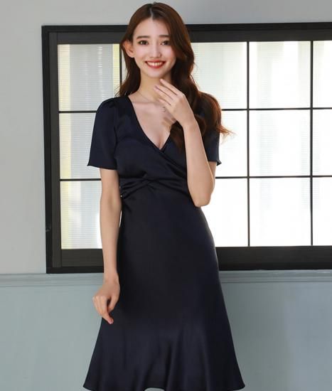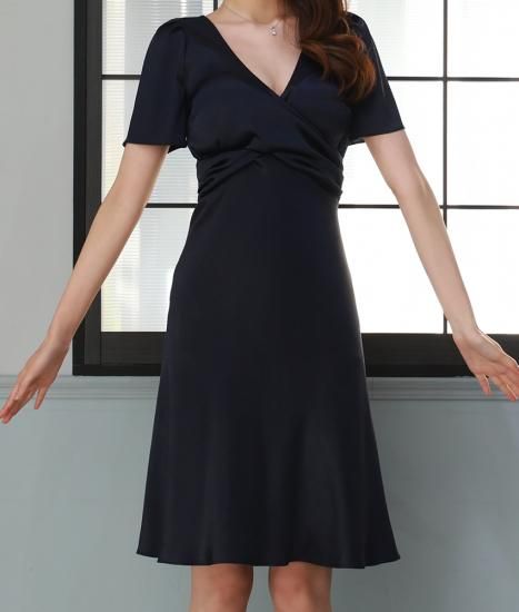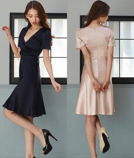 セール |韓国製 | rinfarre | 半袖 サテン Vネック エレガント Aライン 膝丈 ミディアムドレス ワンピース