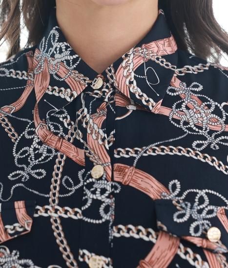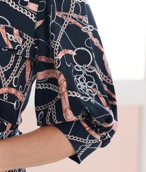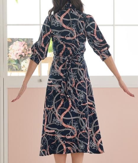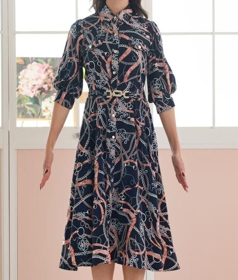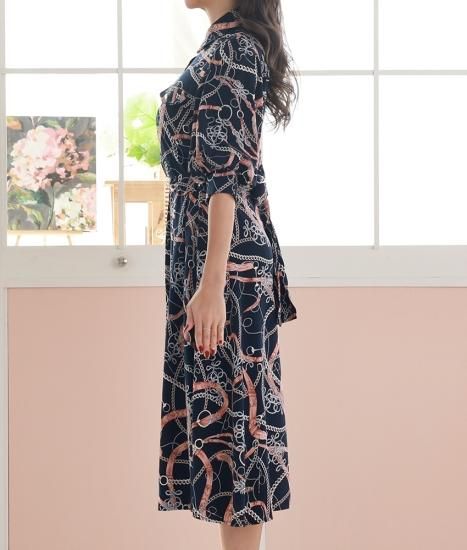 韓国製 | rinfarre | スカーフ柄 五分半袖 パフスリーブ Aライン ネイビー ミディアム ひざ下 ワンピース ドレス my