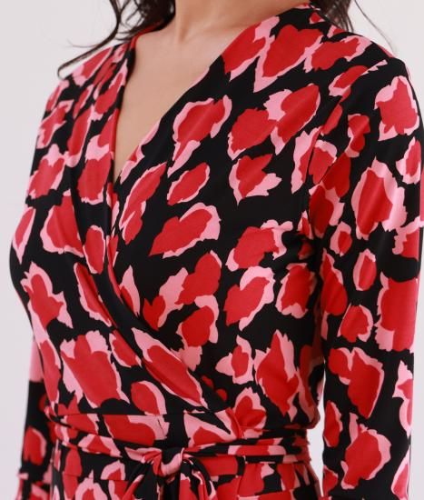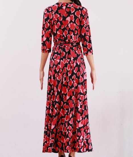 韓国製 | rinfarre | ブラック レッド 花柄 エスニック Vネック カシュクール 七分袖 マキシ ロングドレス ラップ ワンピース