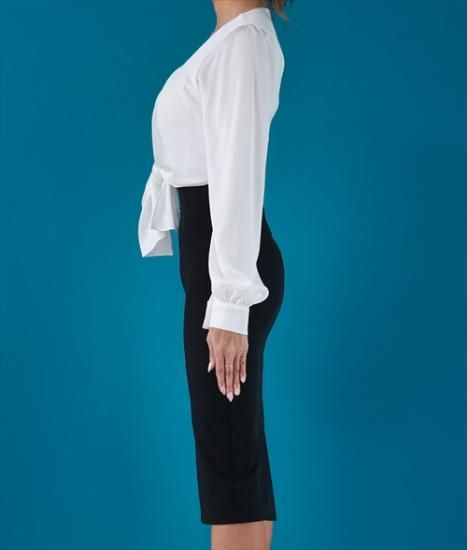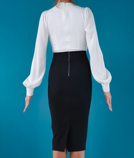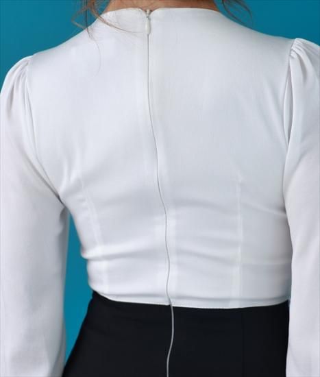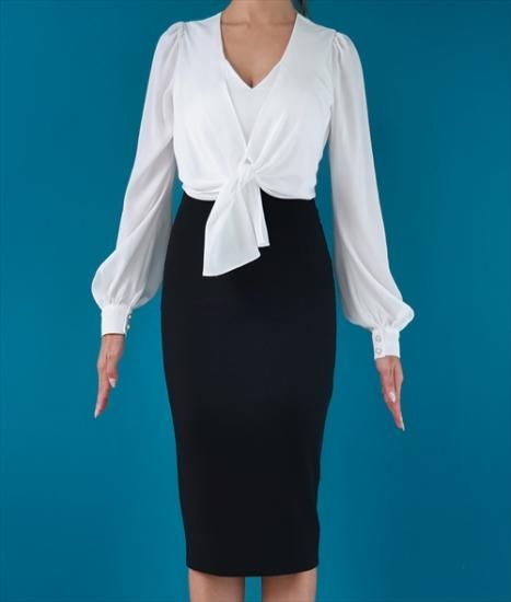韓国製 | rinfarre | ブラック×ホワイト セットアップ風 スカーフ 長袖ブラウス シースルー袖 タイト ミディアムドレス
