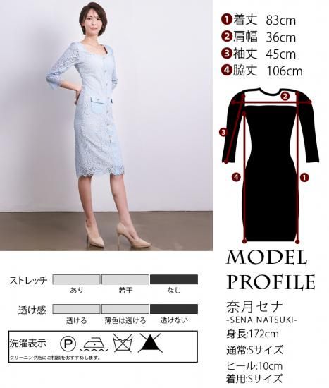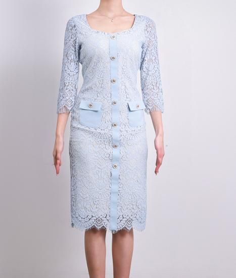 セール | 韓国製 | rinfarre | [rinfarre]七分袖 総レース 飾りボタン ポケット 膝丈 スカイブルー タイト ミディアムドレス ワンピース