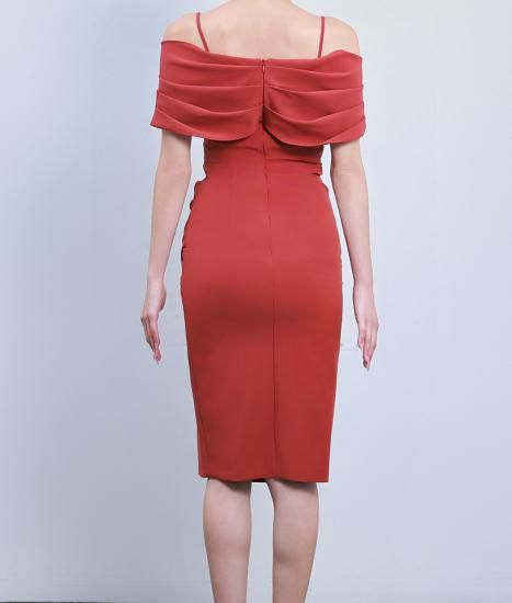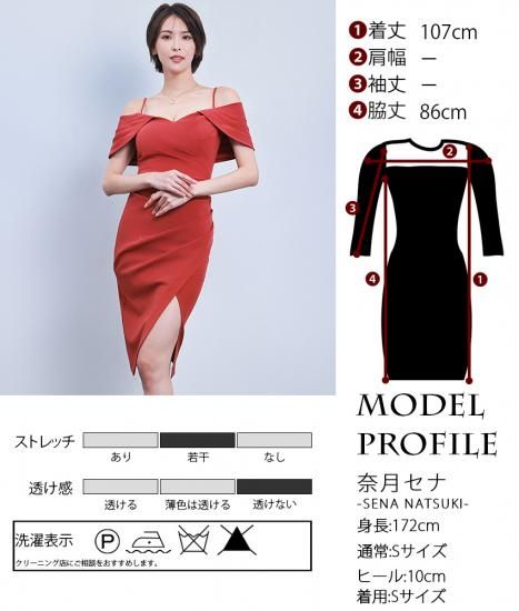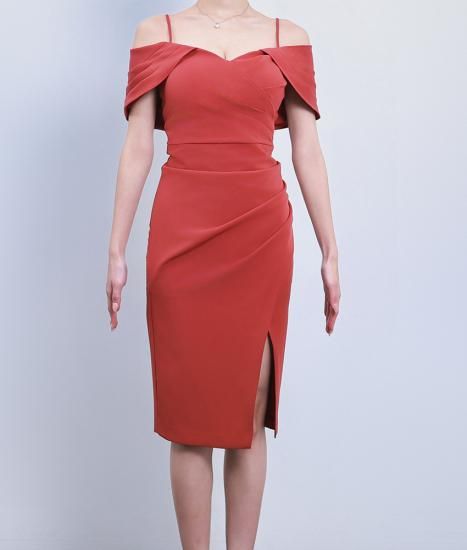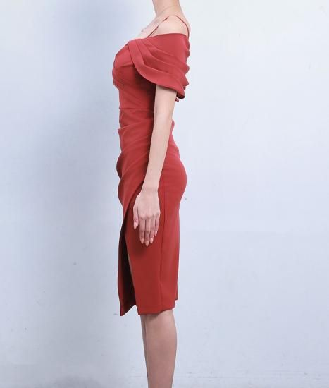 セール | 韓国製 | rinfarre | オープンショルダー テラコッタ スリット タック アシンメトリー セクシー タイト ミディアムドレス ワンピース