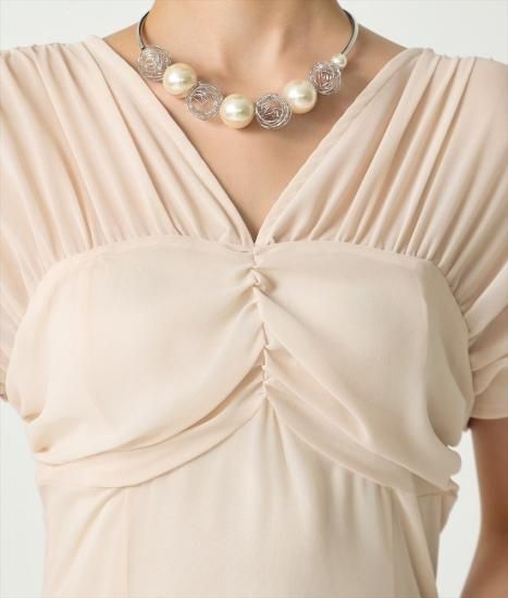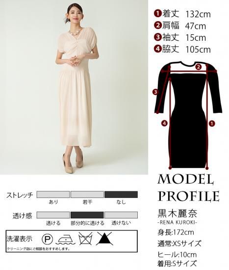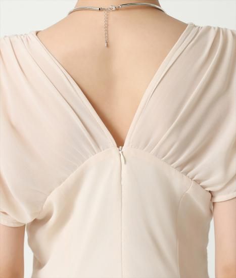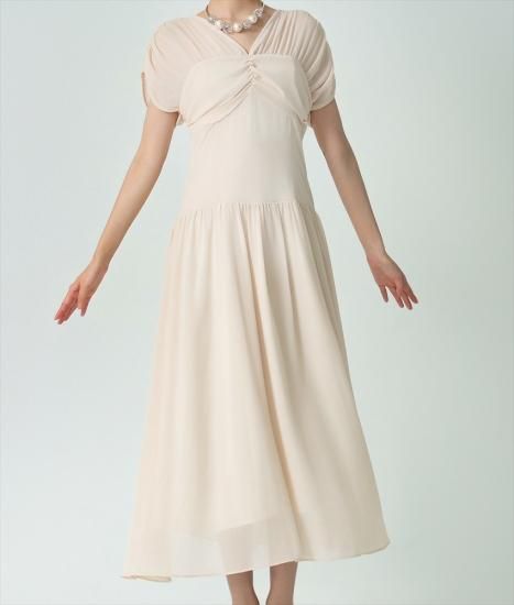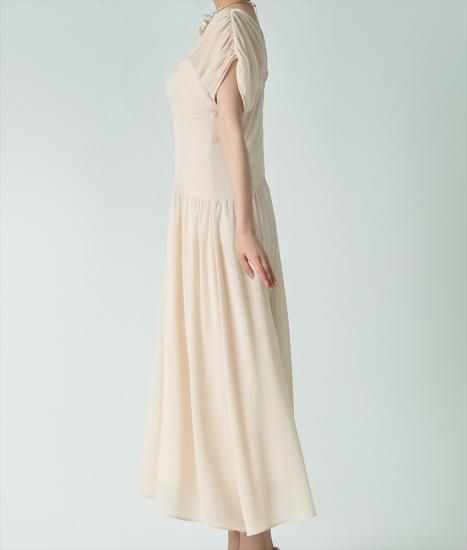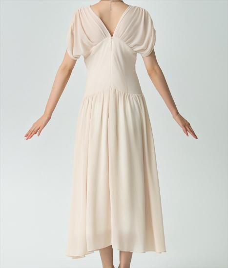 韓国製 | rinfarre | ベージュ シフォン セミロング ドレープスリーブ ウエストシェイプ Aライン 半袖 ロングドレス ワンピース