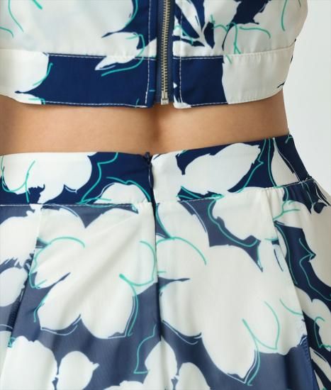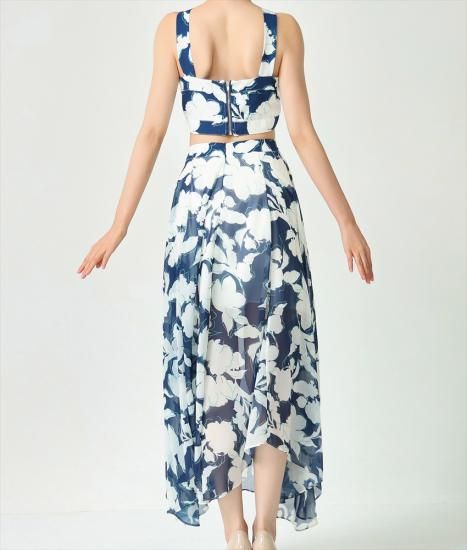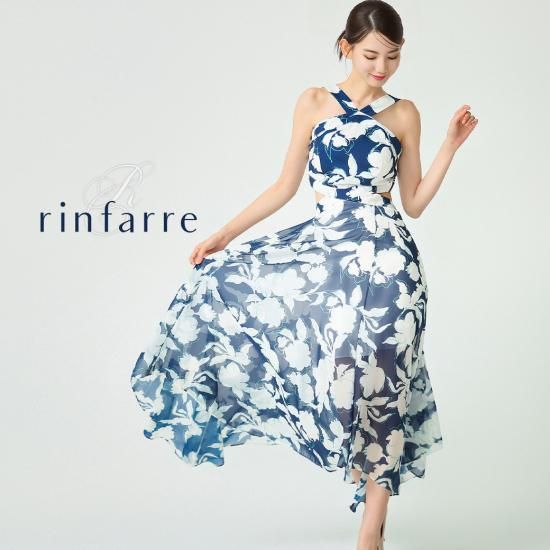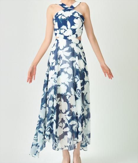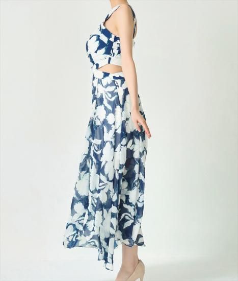 韓国製 | rinfarre | ネイビー 花柄 プリント Vネック ホルターネック シフォン ヘムデザイン ノースリーブ ロングドレス ワンピース