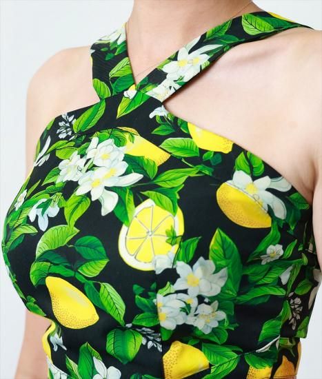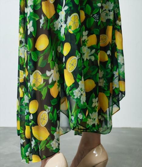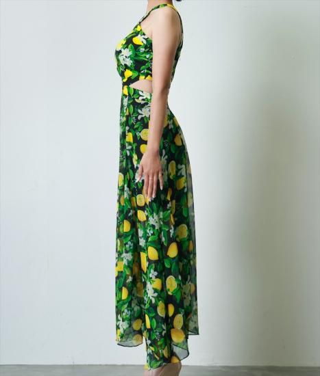 韓国製 | rinfarre | レモン柄 プリント Vネック ホルターネック シフォン ヘムデザイン ノースリーブ ロングドレス ワンピース