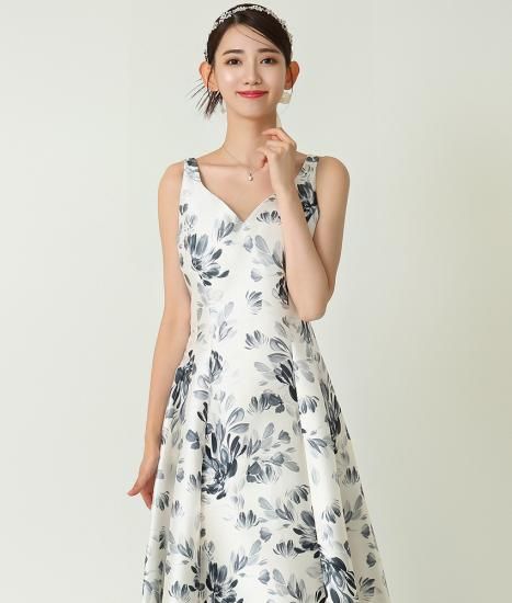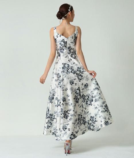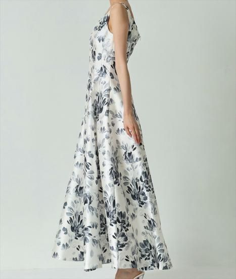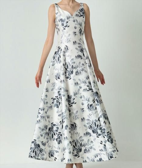 韓国製 | rinfarre | ノースリーブ Vカット 花柄 ホワイト×グレー Aライン ロングドレス ワンピース