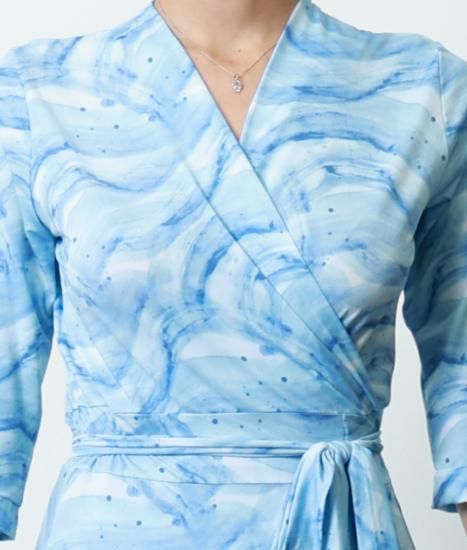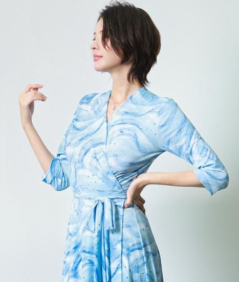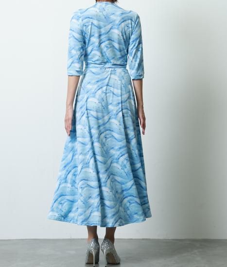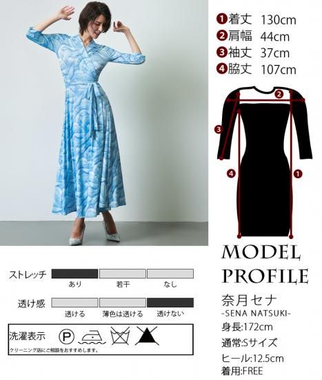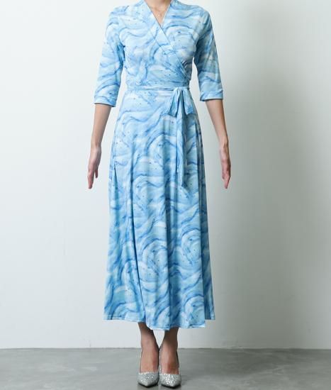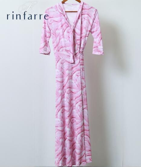 韓国製 | rinfarre | 波柄 ナチュラル Vネック カシュクール 七分袖 マキシ ロングドレス ラップ ワンピース