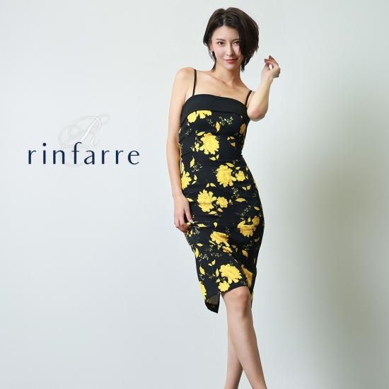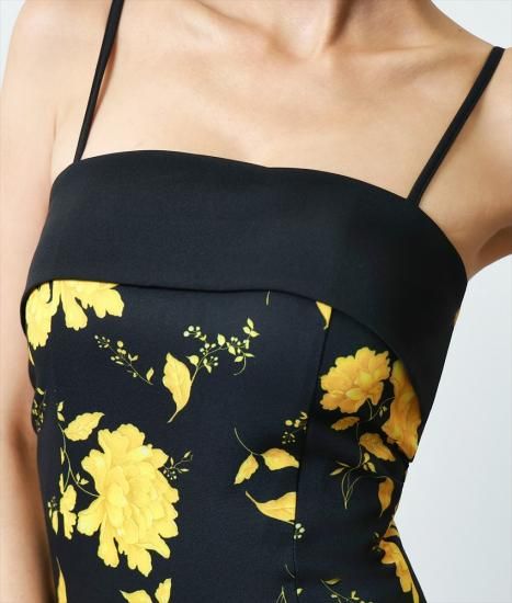 韓国製 | rinfarre | ベア ノースリーブ イエロー ブラック 花柄 ミディアムドレス タイト ワンピース