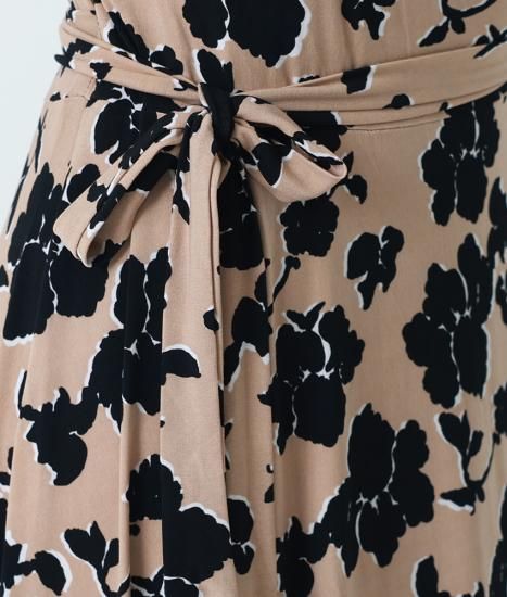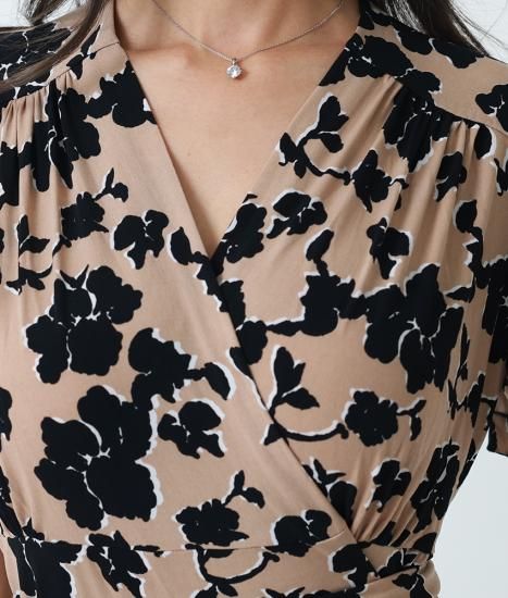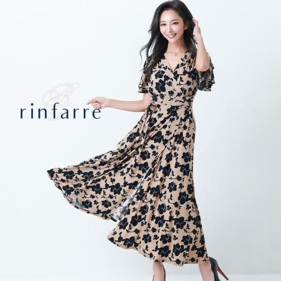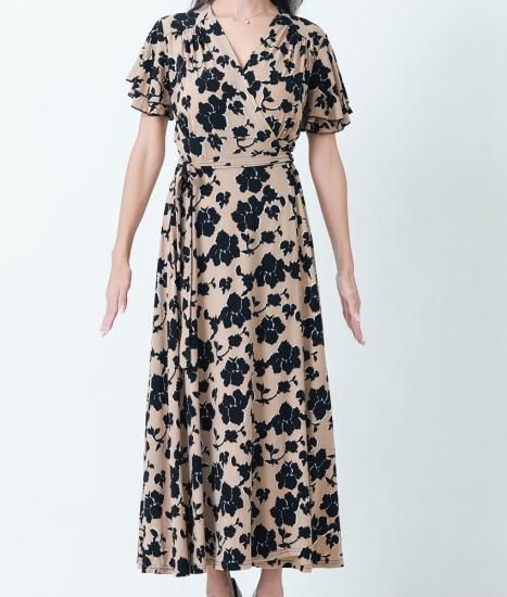 韓国製 | rinfarre | キャメル 花柄 エレガント Vネック カシュクール 半袖 マキシ ロングドレス ラップ ワンピース mycm